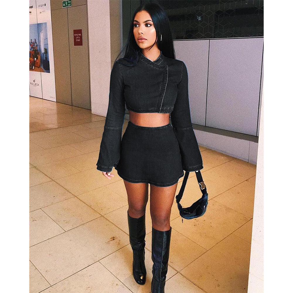 X00269L New arrival women two-piece set+ flared sleeve zipper and sexy buttonsTwo-piece denim skirt